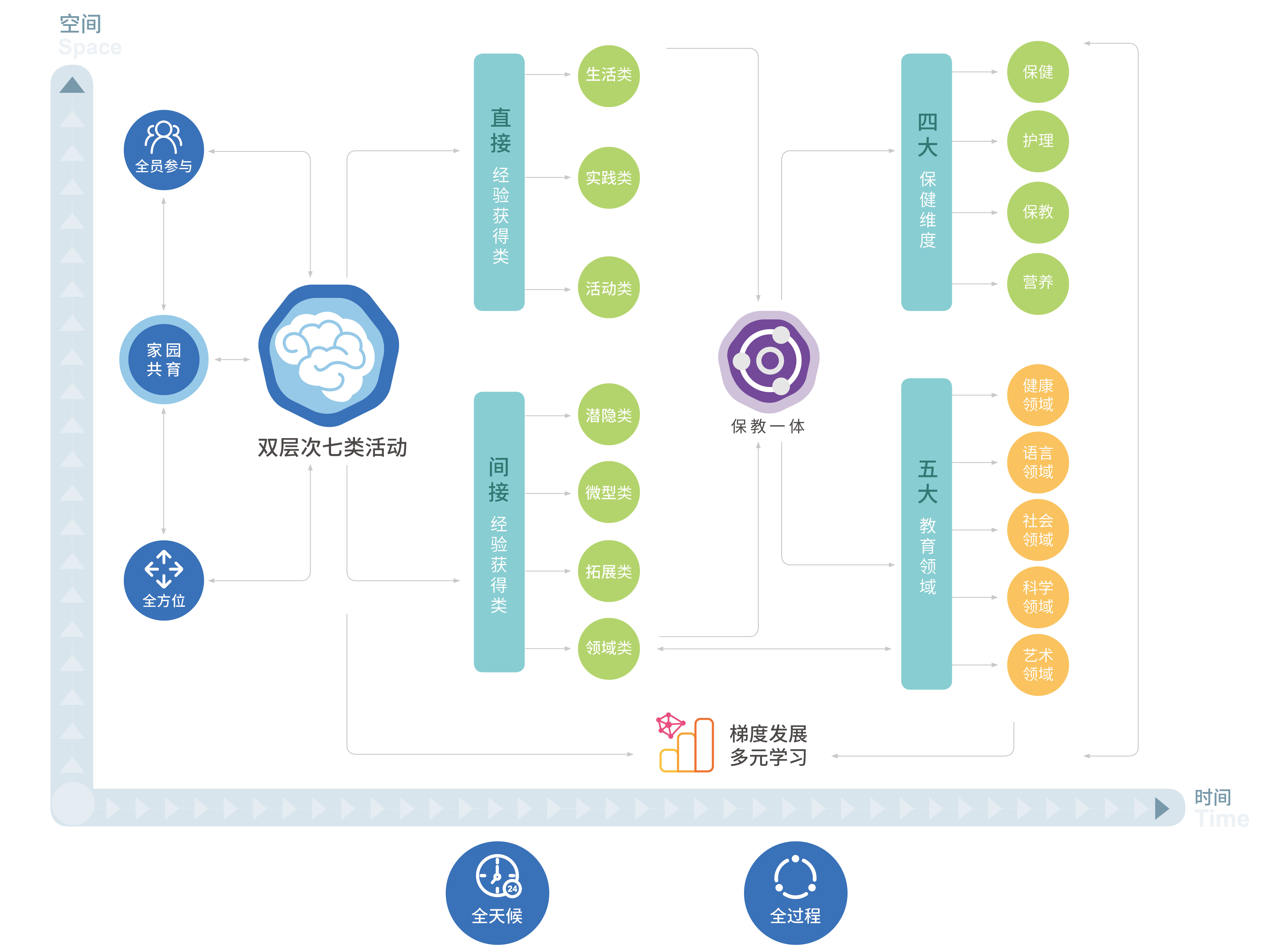 金色摇篮采用的是家园配合下的、全员参与、全方位的双层次七类活动,全天候、全过程覆盖五大教育领域、四大保健维度的保教一体,促进每一个孩子身心和谐发展,实现面向全体的全面发展,让健康聪明的孩子多起来。