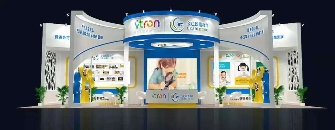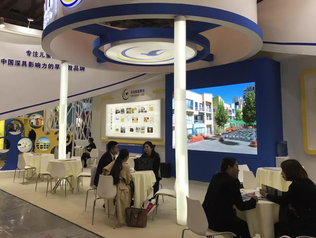 此次亮相,是金色摇篮教育VIS升级以后首次以全新的VI形象公开展出,展位设计以金色摇篮教育新LOGO为基础元素,令人耳目一新的展位设计和配色展示了金色摇篮教育全新的品牌形象,也吸引了众多参观者驻足。