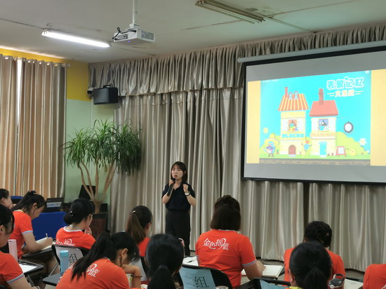 对于言语领域的游戏化教学实施,培训邀请金色摇篮教育直营园校事业部教学部经理韩淑慧老师以《快乐阅读助成长》为题进行详细讲解。韩老师结合幼儿各年龄段特点,为老师们清晰言语领域教学目标,并以此为基础,通过生动的举例来说明言语领域游戏化教学的落地。韩老师将儿歌、故事的教学过程细化为导入、阅读共情、互动体验、自主阅读、活动延伸等步骤,逐一为老师们演示如何上好一节生动的游戏化阅读课程。