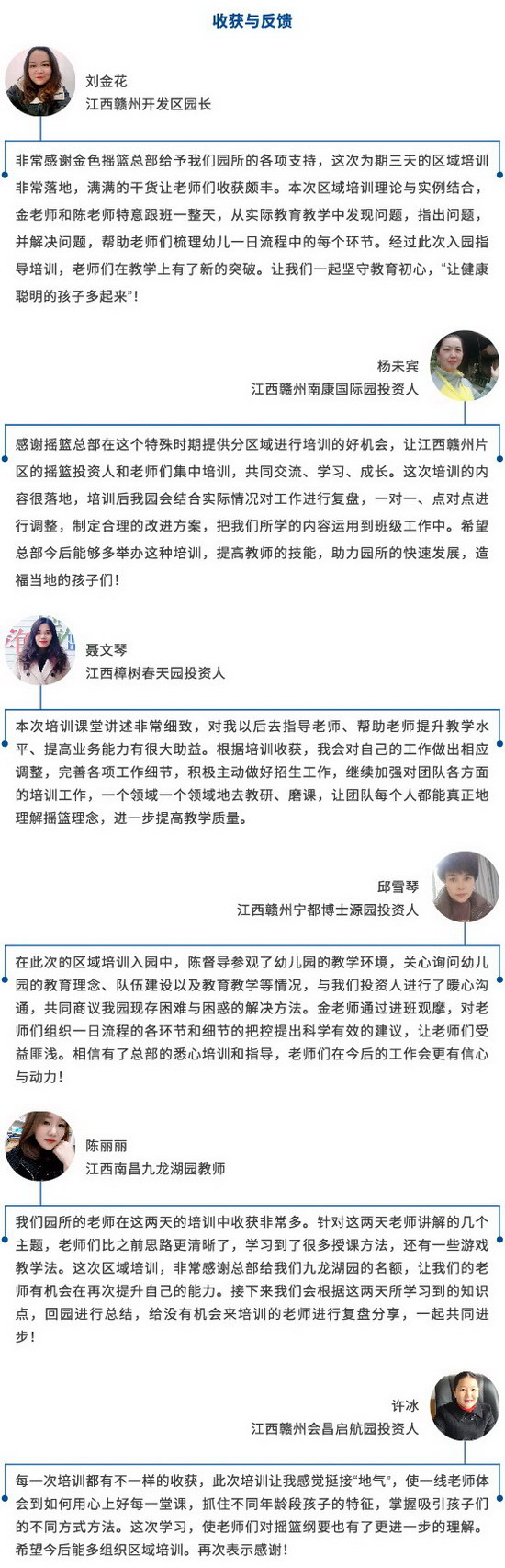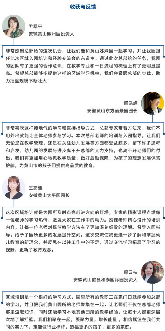 本次区域培训三站齐发,分别得到了安徽黄山徽州园、江西赣州开发区园、湖北黄石黄石港园的承办支持,及合计近20所合作园的积极参与。培训旨在更好地引领金色摇篮合作园的区域品牌联动发展,全面促进合作园教师专业技能水平的提升,助力园所夯实教育质量、增强管理效能。