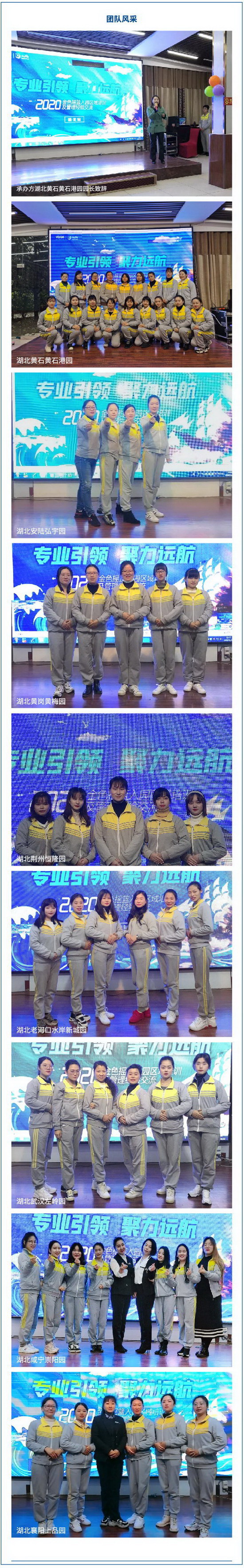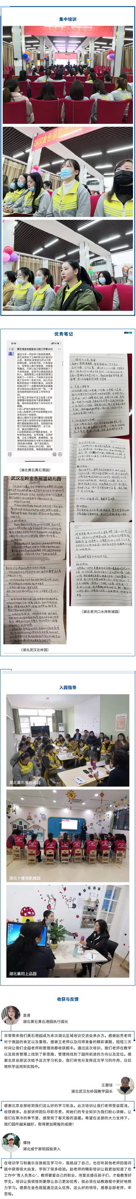 湖北站区域培训及管理经验交流会由湖北黄石黄石港园承办,湖北安陆弘宇园、湖北黄岗黄梅园、湖北荆州恒隆园、湖北老河口水岸新城园、湖北武汉左岭园、湖北咸宁崇阳园、湖北襄阳上品园等园积极参与。另外,湖北十堰领航城园也加入到入园指导培训中。