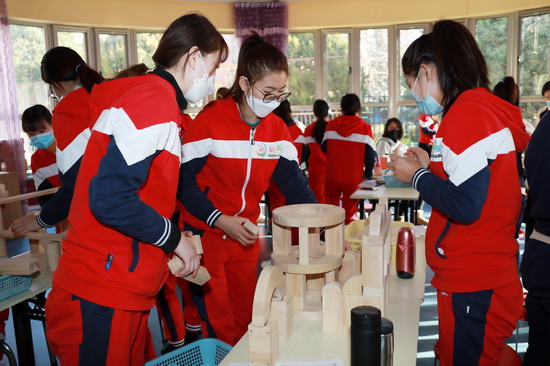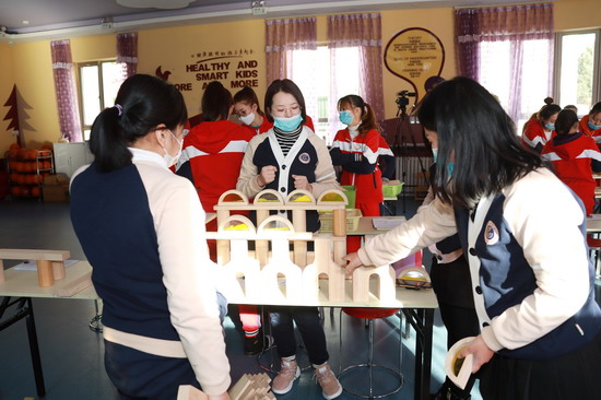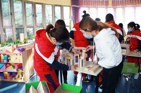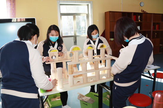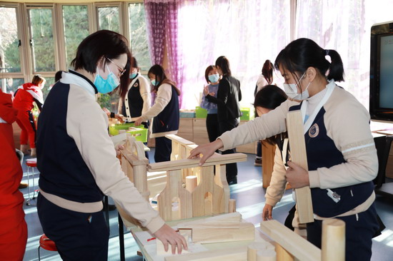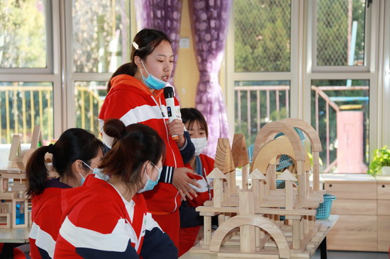 金色摇篮慧忠园保教主任闫玲子老师为大家带来了《“慧玩”建构区》主题分享培训,详细阐述了区域活动的意义和价值,并将建构区的环境创设、材料投放、搭建技巧,以及教师的指导策略一一详解。为了帮助老师们进一步透彻理解建构区的搭建,在培训的实操环节,闫玲子老师还引领大家亲身体验构建过程,共同分享搭建创意与心得,让老师们对此有了更切实的体会。
