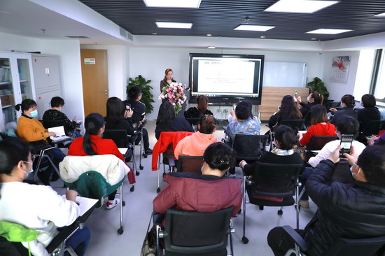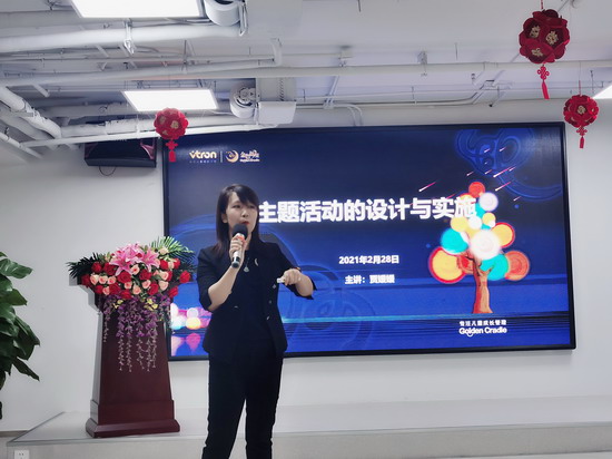随后,直营园校事业部行政管理部督导经理贾媛媛分享了《主题活动的设计与实施》,从幼儿园主题活动的定义、意义、特点及价值、来源、实施过程等几方面多维度进行讲解,为大家展示了如何成功开展深受幼儿喜爱的主题活动。