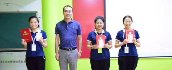 金色摇篮山东事业部总经理韩冰老师为考核成绩前三名的老师颁发“学霸奖”荣誉证书和读书年卡一张。他们分别是临沂艾法薇尔园刘菲菲老师、济宁曲阜园李文文老师、滨州博兴园张卓娜老师。