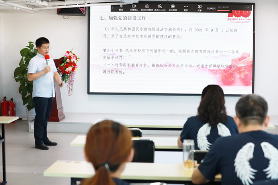 金色摇篮直营幼儿园事业部行政总园长潘广祥老师从行政工作的层面出发,全面阐述了金色摇篮直营园在规范园务管理、强化安全管理、夯实团队建设、加强主题活动、提升党团工会工作等方面出色完成了前一阶段的工作。潘广祥老师表示,在新学期,园所行政工作仍然要围绕依法办园、有序经营,提升家长满意度,明确团队管理目标,师德建设长抓不懈,后勤管理精益求精,园务管理形成常规,加强党的建设工作为重点内容展开,为园所强基固本谋发展,守正出新开新篇。