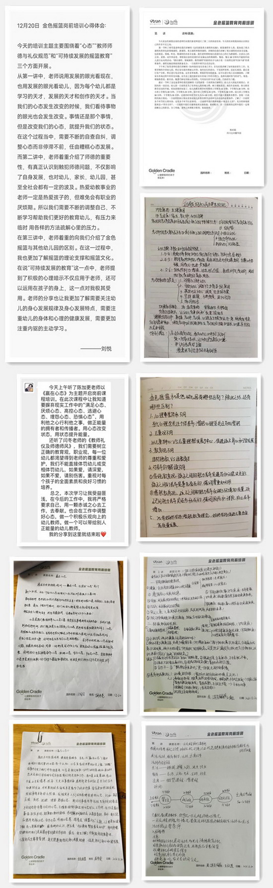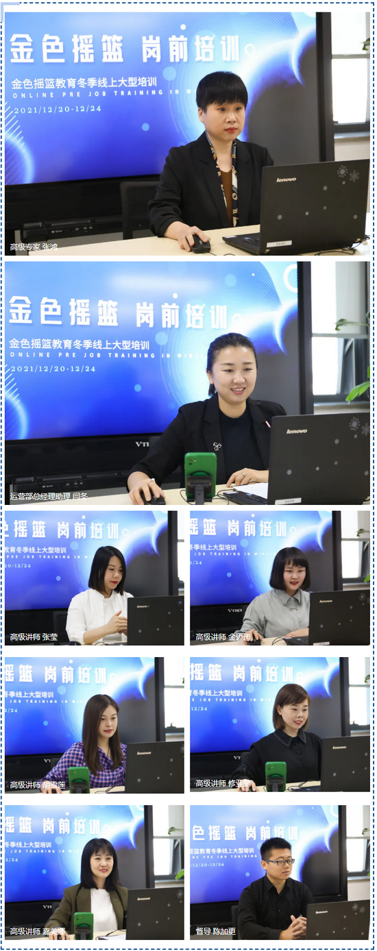 为打造优质的教师团队,用过硬的师资力量保障园所的高品质办园,2021年12月20日-24日,“金色摇篮岗前培训——冬季线上大型培训”圆满举办,来自金色摇篮全国各地80余所合作园的500余名教师参加了本次线上培训。此次培训,旨在帮助提升合作园教师职业素质,提高教师专业技能,帮助园所打造优质的教师团队,助推金色摇篮合作园提升教学质量,打造高品质园所,为让家长满意的幼儿园提供有力保障。