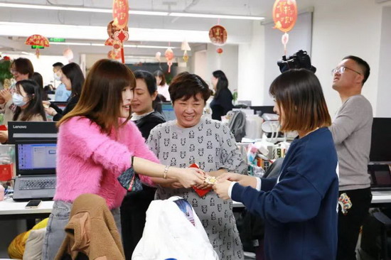 会议在各团队士气高昂的口号中落下帷幕,温暖却在惊喜中接踵而来,平台领导亲自到工位为大家送上了开工红包。