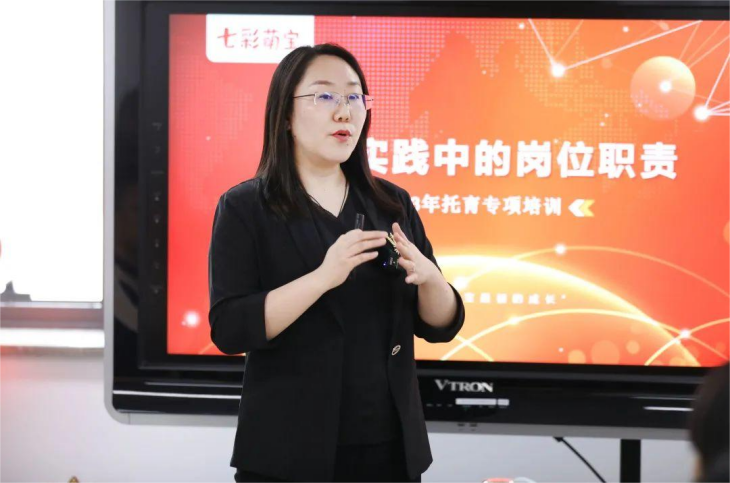七彩萌宝托育项目的落地,需要以优秀的师资团队为保障。威创儿童成长平台托育研培总监姜晓微老师,从团队建设、师资培养的角度出发,为管理者阐明园长、后勤主管、保教主管、市场主管、亲子教师、托班教师等岗位设置和职责,详解了如何搭建团队、培养高素质的教师。她还着重强调了托育项目启动阶段中,包括盘点园本情况、开展市场调研、确定招生活动、筹备启动会、开展招生活动、开班定向会、正式开课在内的“七步推进计划”,让园所对项目实施更加胸有成竹。