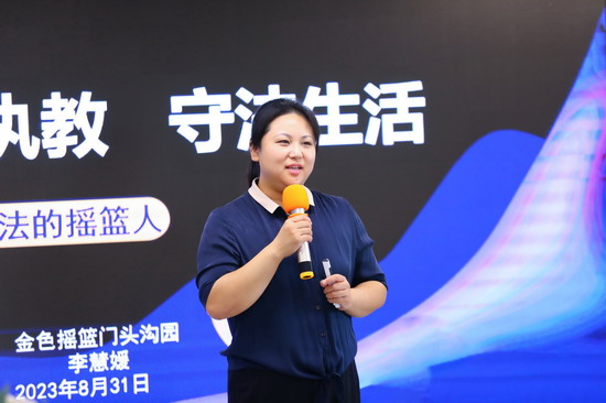 门头沟园园长李慧媛分享了如何依法执教,守法生活。她从依法开展保教工作、依法开展家长工作、做知法守法好公民三个角度,带领大家学习相关法律法规,提醒大家身为教师,要使用规范的语言,遵守职业道德,保持师者风范,用心呵护幼儿安全,学法知法守法,让生活更美好。