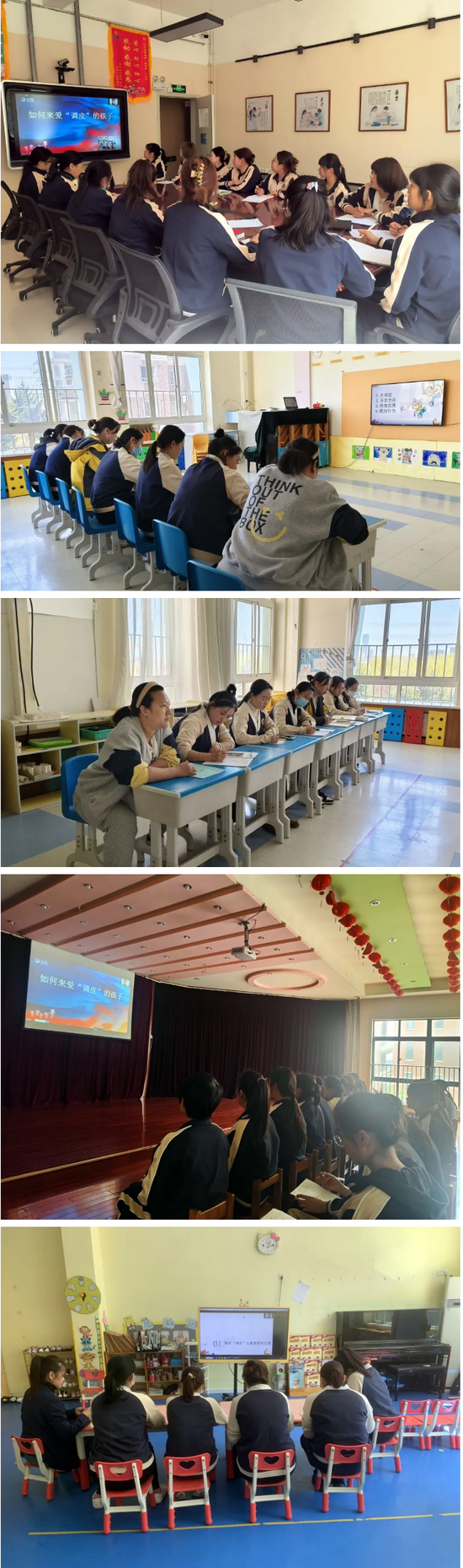 杨老师讲到,孩子调皮捣蛋往往是父母过分娇宠、纵容,隔代教养、保姆带孩子的溺爱,父母缺乏爱心,孩子自制力差、易冲动等原因造成的。因此,老师们不仅要自己学会如何指导孩子,同时也要从家长入手,取得家长的配合,才能真正地解决问题。