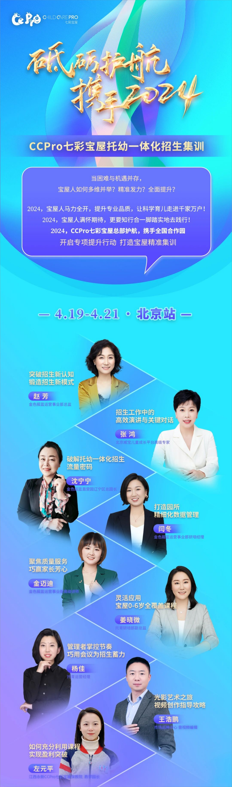 生源是园所的生存命脉,随着竞争的日益激烈和出生率的下降,园所招生变得更具挑战性,做好招生工作,不仅是每个园所面临的大事,更是必须具备的能力。为了帮助园所提升招生能力,激活生命之源,4月19日-21日,“砥砺护航 携手2024——CCPro七彩宝屋托幼一体化招生集训”在京举办。本次培训得到园所的积极响应和参与,有效发挥了总部引领的力量,促进了CCPro七彩宝屋全国合作伙伴携手学习、增进交流、共同提升。